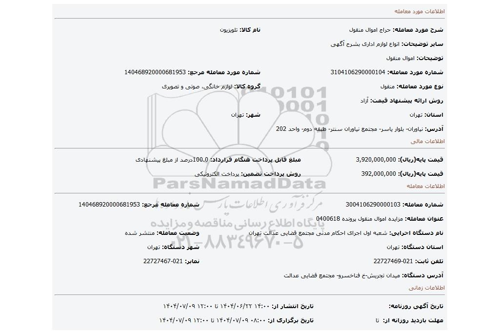 | عنوان معامله: مزایده اموال منقول پرونده 0400618 | ||