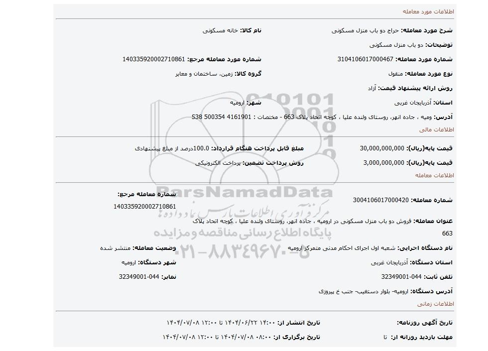 | شرح مورد معامله: حراج دو باب منزل مسکونی | نام کالا: خانه مسکونی | |