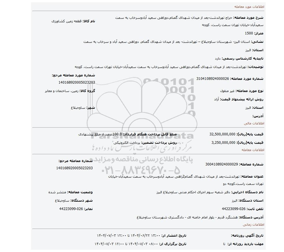 | شرح مورد معامله: حراج تهراندشت-بعد از میدان شهدای گمنام،دوراهی سعید آبادوسرخاب به سمت سعیدآباد-خیابان تهران سمت راست، کوچه | نام کالا: قطعه زمین کشاورزی | |