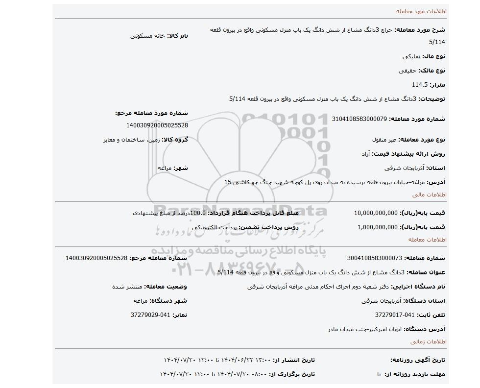 | شماره مورد معامله: 3104108583000079 | شماره مورد معامله مرجع: 140030920005025528 | |