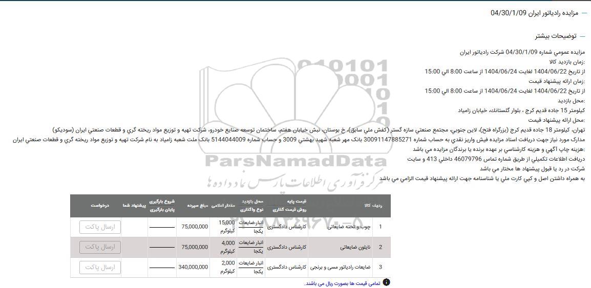 مزایده عمومی شماره 04/30/1/09 شرکت رادیاتور ایران
