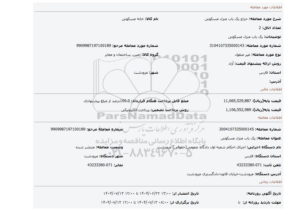 | شماره مورد معامله: 3104107335000143 | شماره مورد معامله مرجع: 9909987197100189 | |