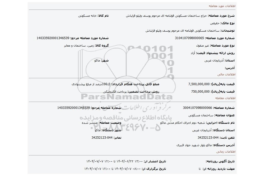| قیمت پایه(ریال): 750,000,000 | روش پرداخت تضمین: پرداخت الکترونیکی |