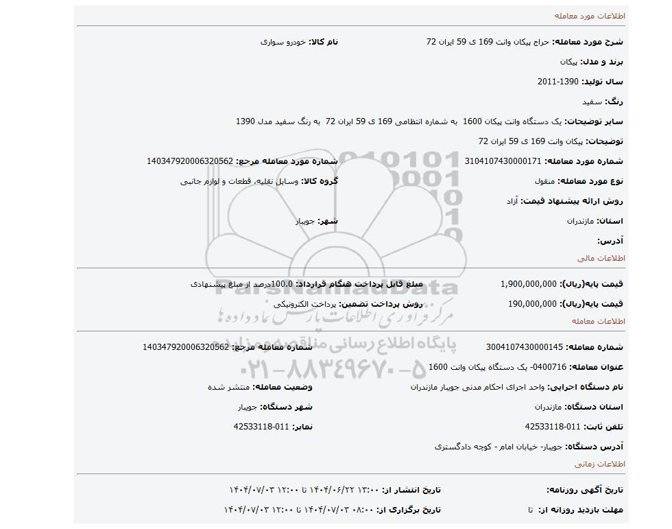 | سایر توضیحات: یک دستگاه وانت پیکان 1600 به شماره انتظامی 169 ی 59 ایران 72 به رنگ سفید مدل 1390 | ||