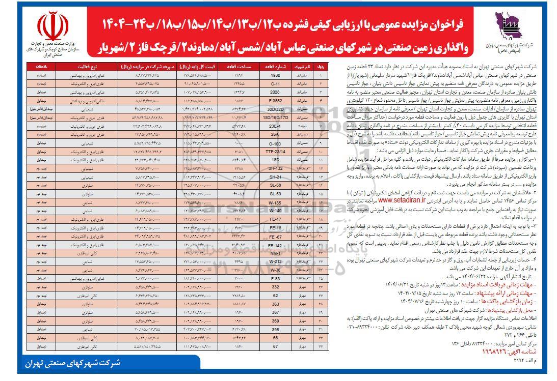 شرکت شهرکهای صنعتی تهران به استناد مصوبه هیأت مدیره این شرکت در نظر دارد تعداد 33 قطعه زمین صنعتی در شهرکهای صنعتی عباس آباد/شمس آباد/ دماوند 2/ قرچک فاز 2/ شهریار را از طریق مزایده عمومی به دارندگان معرفی نامه منضم به پیش نمایش جواز تاسیس دانش بنیان جواز تاسیس دانش بنیان صادره از سازمان صنعت معدن و تجارت استان تهران مجوز فعالیت صنعتی معتبر منضم به نامه واگذاری زمین معرفی نامه منضم به پیش نمایش جواز تاسیس جواز تاسیس داخل محدوده شعاع 120 کیلومتری تهران صادره از سازمان ادارات صنعت معدن و تجارت استان تهران معرفی نامه از سازمان جهاد کشاورزی استان تهران با کاربری های جدول ذیل با زون فعالیت و مساحت قطعه مورد درخواست حداکثر میزان مساحت قطعه انتخابی توسط مزایده گر می بایست 40% کمتر یا بیشتر از مساحت مندرج در نامه واگذاری زمین نامه طرح توسعه و یا  معرفی نامه پیش نمایش جواز تاسیس جواز تاسیس باشد مطابقت داشته باشد را به شرح ذیل و با جزییات مندرج در اسناد مزایده با بهره گیری از سامانه تدارکات الکترونیکی دولت ستاد به صورت نقد و اقساط مطابق ضوابط و مقرارت جاری شرکت واگذار نماید.