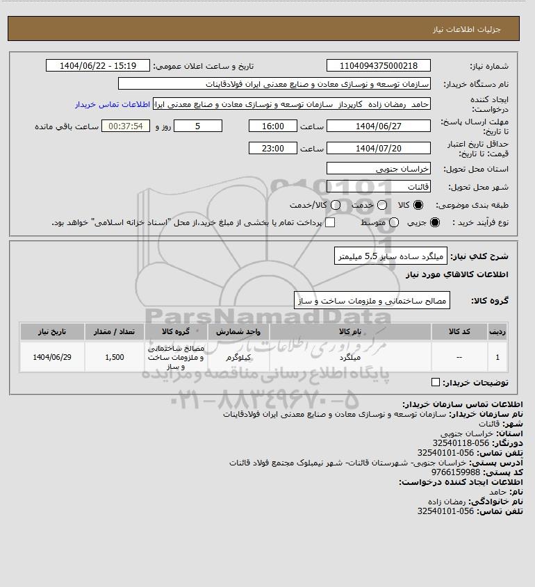 | 1 | -- | میلگرد | کیلوگرم | مصالح ساختمانی و ملزومات ساخت و ساز | 1,500 | 1404/06/29 |