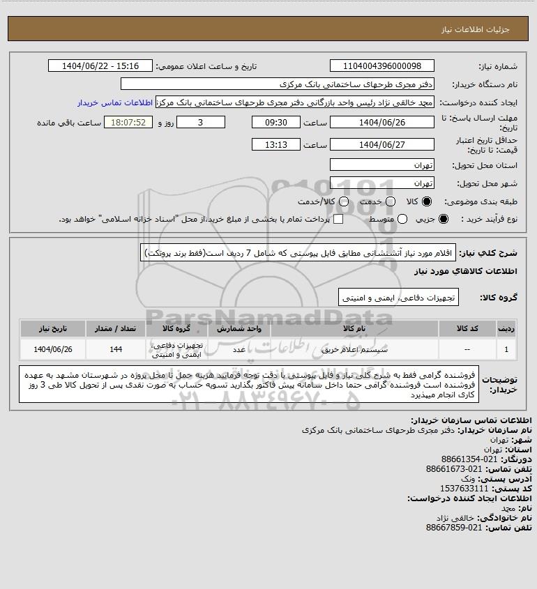 | 1 | -- | سیستم اعلام حریق | عدد | تجهیزات دفاعی، ایمنی و امنیتی | 144 | 1404/06/26 |