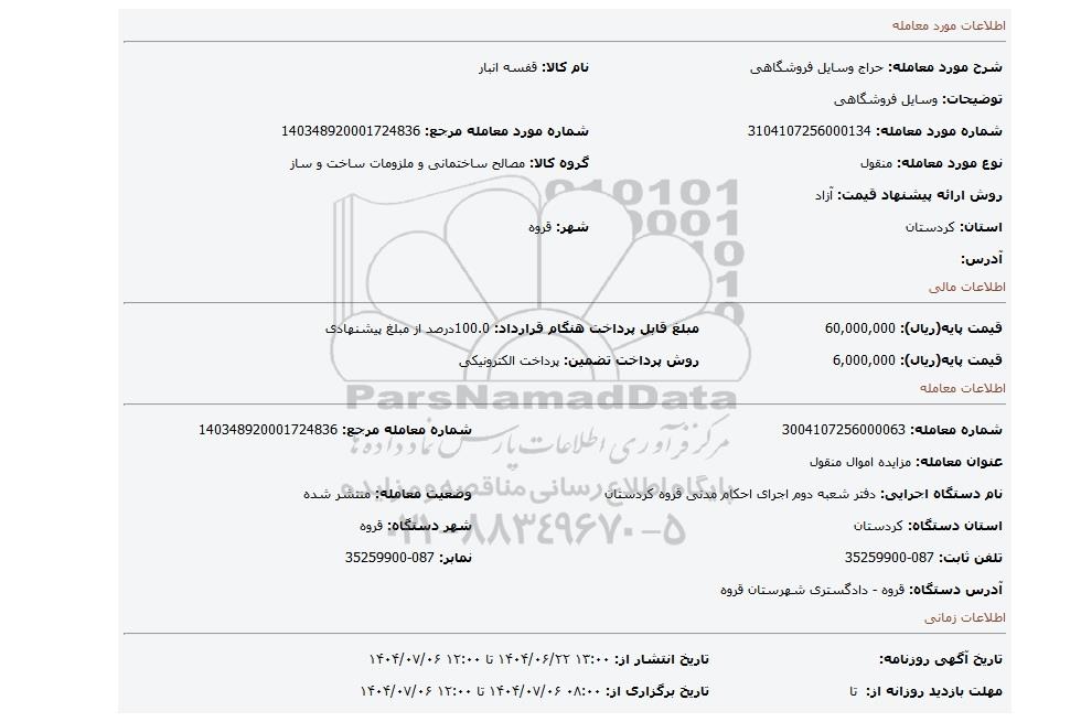 | شماره مورد معامله: 3104107256000134 | شماره مورد معامله مرجع: 140348920001724836 | |