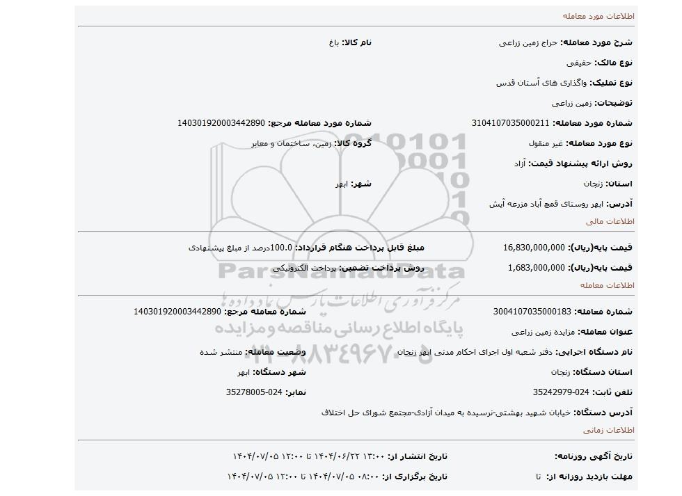 مزایده عمومی مزایده زمین زراعی برگزار میگردد. از کلیه افراد متخصص و شرکتهای واجد شرایط دعوت به عمل میآید تا در این مزایده با کد خبرگزاری پارس نماد : 9538027 شرکت نمایند تاریخ شروع مزایده : 1404/06/22 مهلت شرکت در مزایده: تا پایان روز 1404/07/05