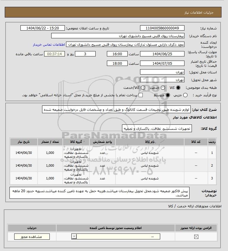 | 3 | -- | شوینده لباس | عدد | تجهیزات شستشو، نظافت، پاکسازی و تصفیه | 1,000 | 1404/06/30 |