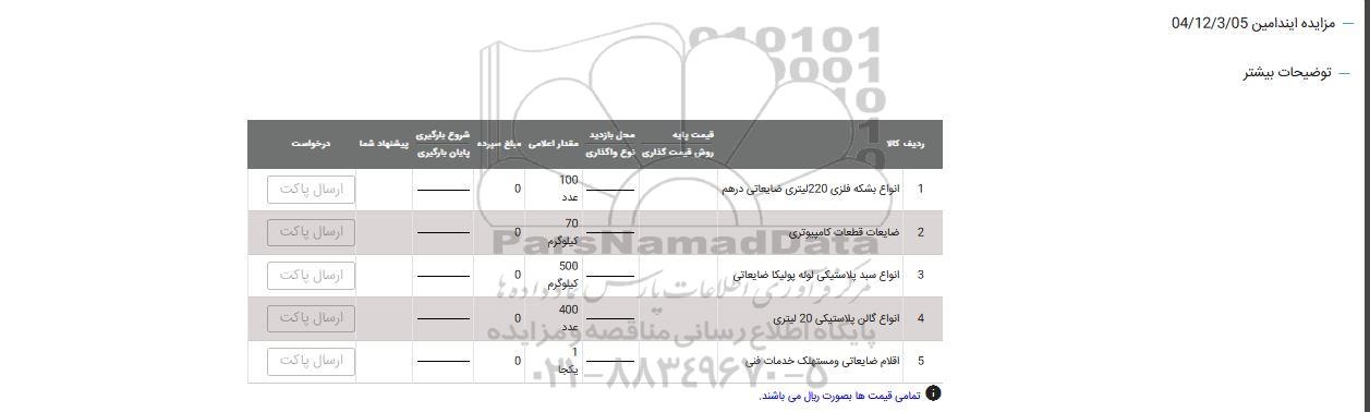 | 5 | اقلام ضایعاتی و مشتهلک خدماتی فنی | 1 یکجا |