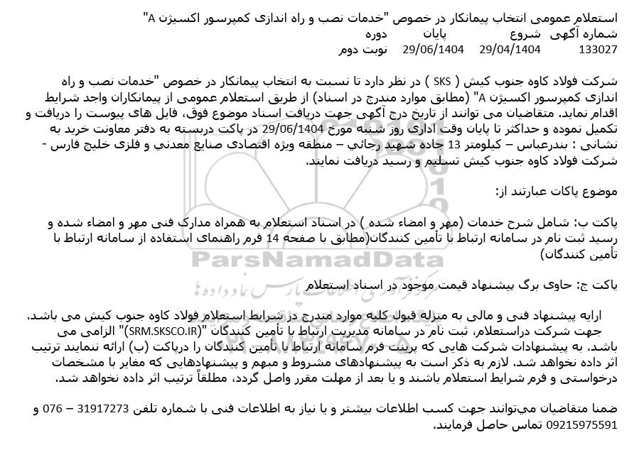 شرکت فولاد کاوه جنوب کیش (SKS) در نظر دارد تا نسبت به انتخاب پیمانکار در خصوص "خدمات نصب و راه اندازی کمپرسور اکسیژن A" (مطابق موارد مندرج در اسناد) از طریق استعلام عمومی از پیمانکاران واجد شرایط اقدام نماید. متقاضیان می توانند از تاریخ درج آگهی جهت دریافت اسناد موضوع فوق، فایل های پیوست را دریافت و تکمیل نموده و حداکثر تا پایان وقت اداری روز شنبه مورخ 1404/06/29 در پاکت دربسته به دفتر معاونت خرید به نشانی : بندرعباس – کیلومتر 13 جاده شهید رجائی – منطقه ویژه اقتصادی صنایع معدنی و فلزی خلیج فارس - شرکت فولاد کاوه جنوب کیش تسلیم و رسید دریافت نمایند.