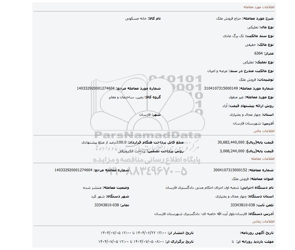 | شماره مورد معامله: 3104107315000149 | شماره مورد معامله مرجع: 140332920001274604 | |