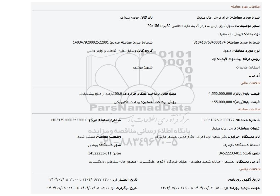 | قیمت پایه(ریال): 455,000,000 | روش پرداخت تضمین: پرداخت الکترونیکی |