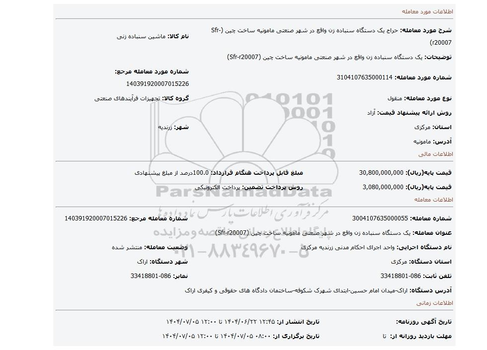 | عنوان معامله: یک دستگاه سنباده زن واقع در شهر صنعتی مامونیه ساخت چین (Sfr-r20007) | ||