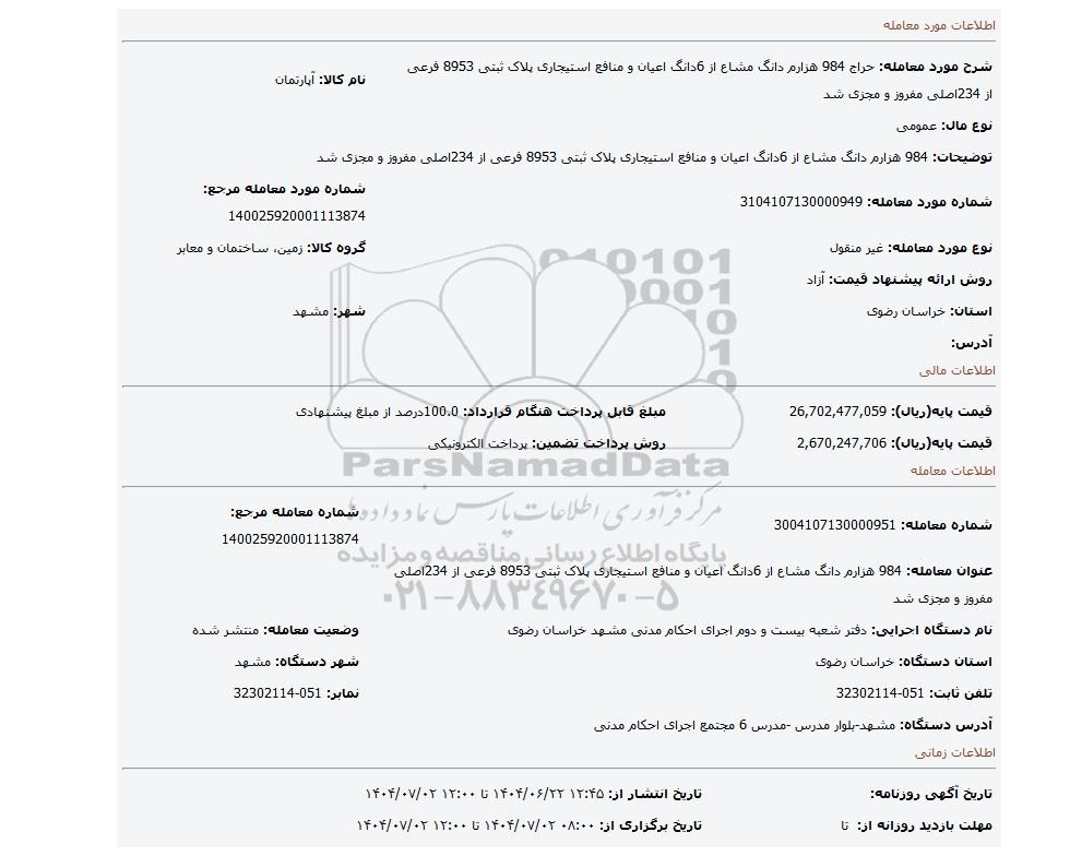 | شرح مورد معامله: حراج 984 هزارم دانگ مشاع از 6دانگ اعیان و منافع استیجاری پلاک ثبتی 8953 فرعی از 234اصلی مفروز و مجزی شد | نام کالا: آپارتمان | |