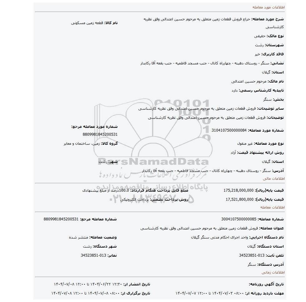 | عنوان معامله: فروش قطعات زمین متعلق به مرحوم حسین اعتدالی وفق نظریه کارشناسی | ||