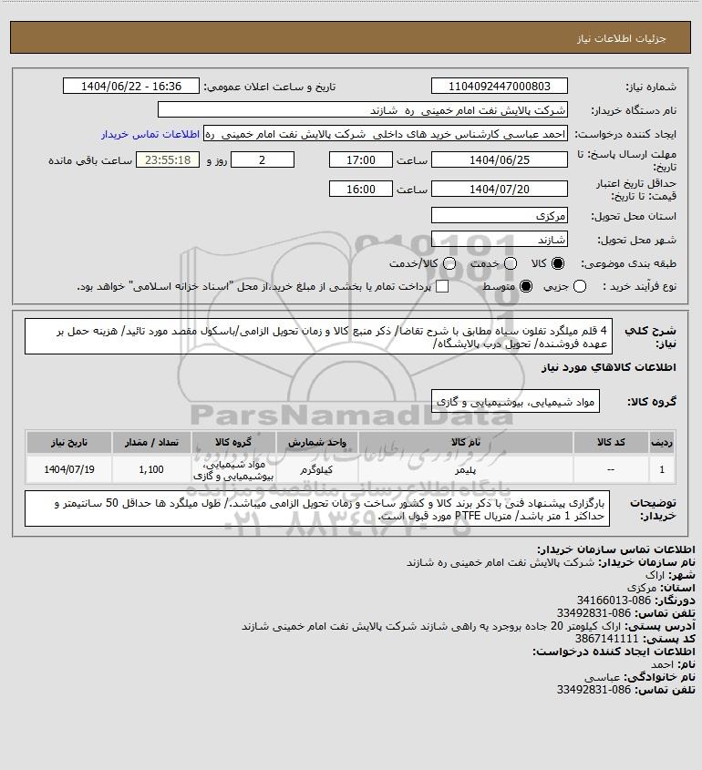 شرح کلی نیاز: 4 قلم میلگرد تفلون سیاه مطابق با شرح تقاضا/ ذکر منبع کالا و زمان تحویل الزامی/باسکول مقصد مورد تائید/ هزینه حمل بر عهده فروشنده/ تحویل درب پالایشگاه/