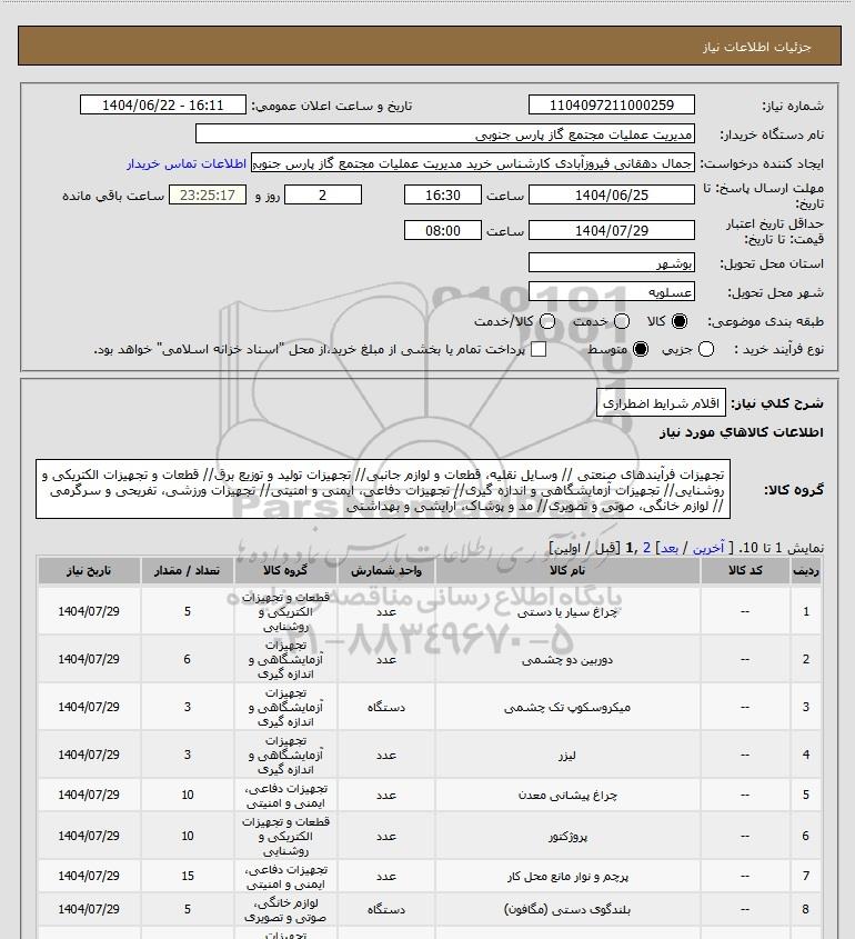 شرح کلی نیاز: اقلام شرایط اضطراری