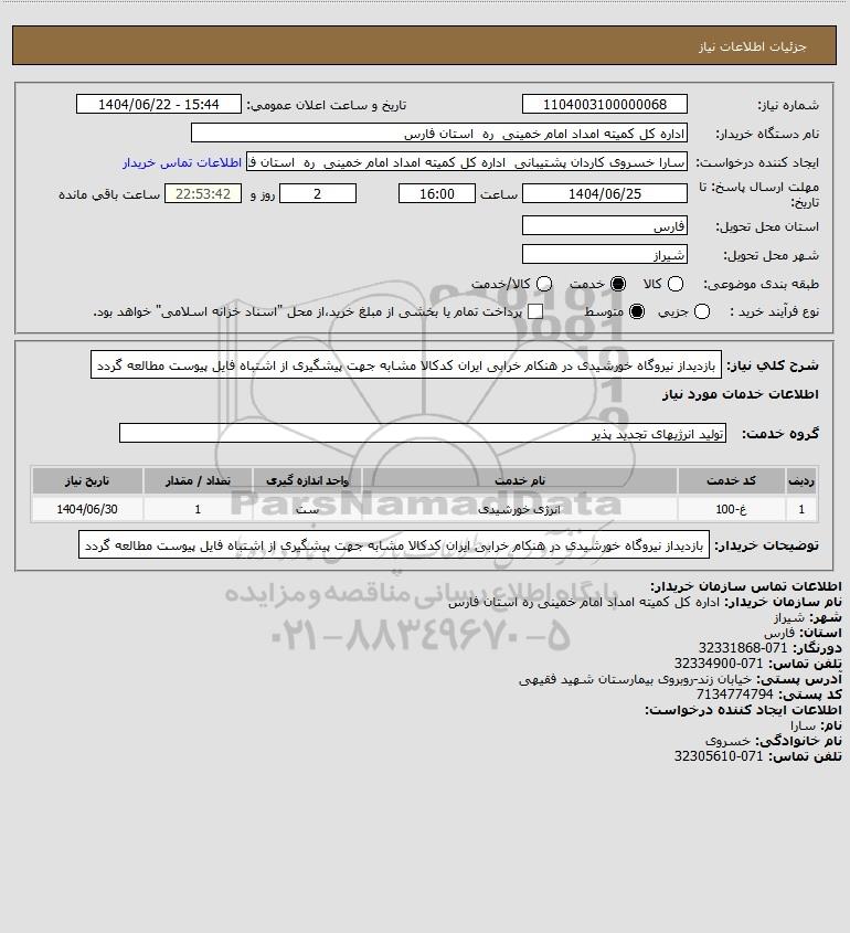 شرح کلی نیاز: بازدیداز نیروگاه خورشیدی در هنکام خرابی ایران کدکالا مشابه جهت پیشگیری از اشتباه فایل پیوست مطالعه گردد