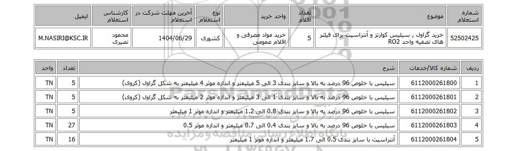 | 52502425 | خرید گراول , سیلیس کوارتز و آنتراسیت برای فیلتر های تصفیه واحد RO2 | 5 | خرید مواد مصرفی و اقلام عمومی | کشوری | 1404/06/29 | محمود نصیری | M.NASIRI@KSC.IR |