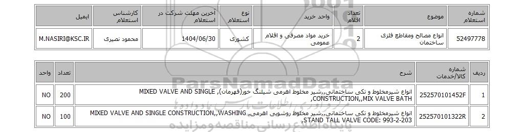 52497778انواع مصالح ومقاطع فلزی ساختمان2خرید مواد مصرفی و اقلام عمومیکشوری1404/06/30محمود نصیریM.NASIRI@KSC.IR