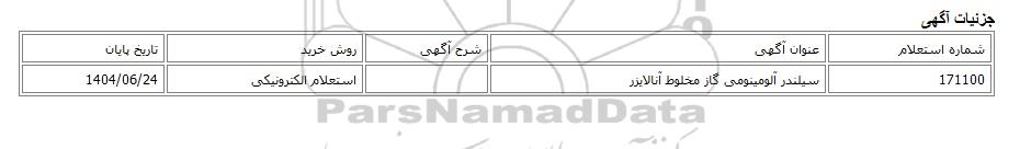 | 171100 | سیلندر آلومینومی گاز مخلوط آنالایزر | استعلام الکترونیکی | 1404/06/24 |