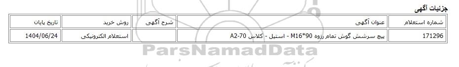 171296پیچ سرشش گوش تمام رزوه M16*90 - استیل - کلاس A2-70استعلام الکترونیکی1404/06/24