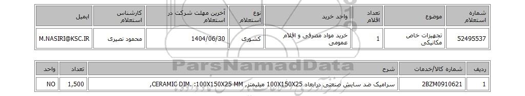 | 52495537 | تجهیزات خاص مکانیکی | 1 | خرید مواد مصرفی و اقلام عمومی | کشوری | 1404/06/30 | محمود نصیری | M.NASIRI@KSC.IR |