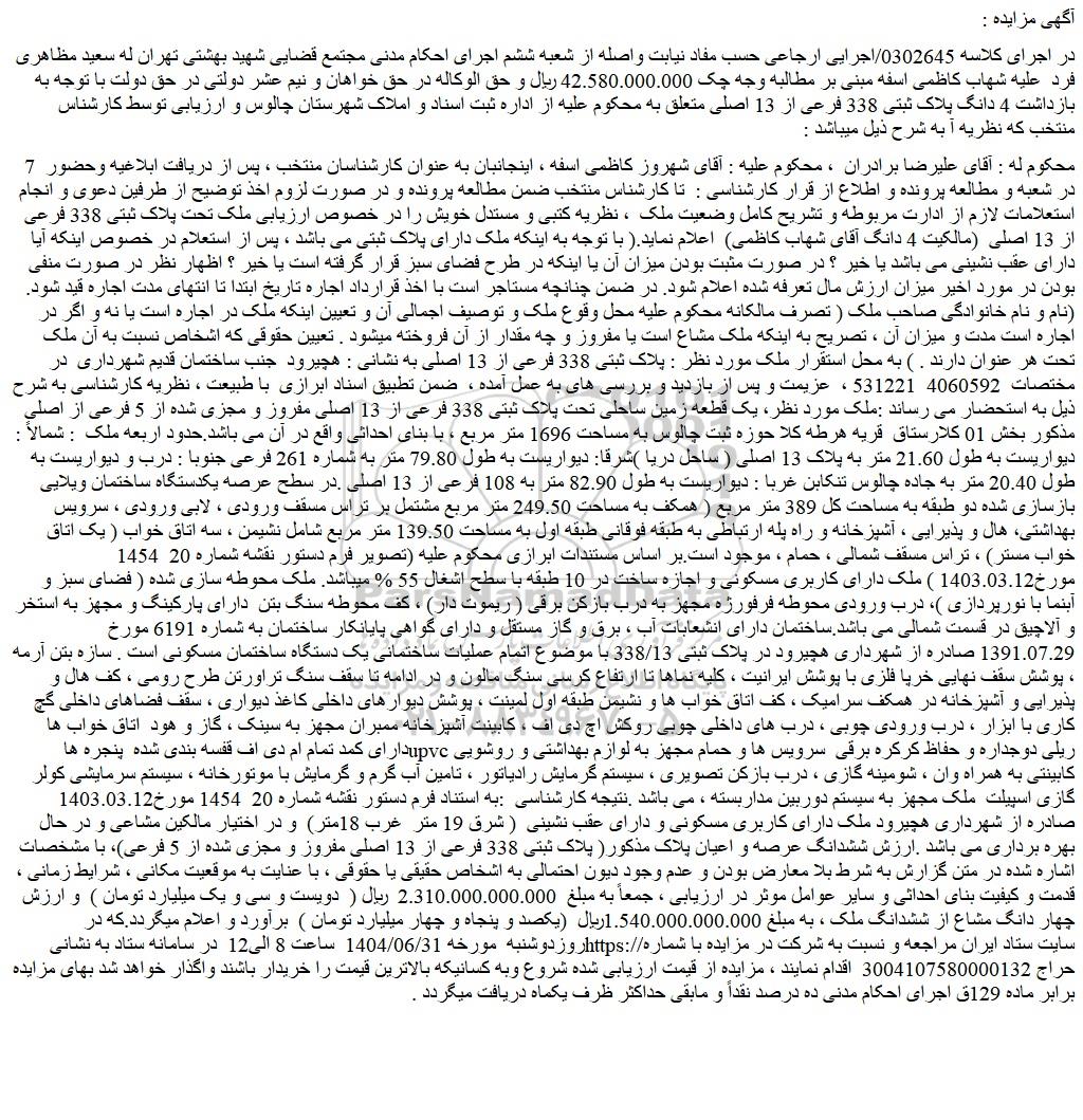 در اجرای کلاسه 0302645/اجرایی ارجاعی حسب مفاد نیابت واصله از شعبه ششم اجرای احکام مدنی مجتمع قضایی شهید بهشتی تهران له سعید مظاهری فرد علیه شهاب کاظمی اسفه مبنی بر مطالبه وجه چک 42.580.000.000 ریال و حق الوکاله در حق خواهان و نیم عشر دولتی در حق دولت با توجه به بازداشت 4 دانگ پلاک ثبتی 338 فرعی از 13 اصلی متعلق به محکوم علیه از اداره ثبت اسناد و املاک شهرستان چالوس و ارزیابی توسط کارشناس منتخب که نظریه آ به شرح ذیل میباشد :