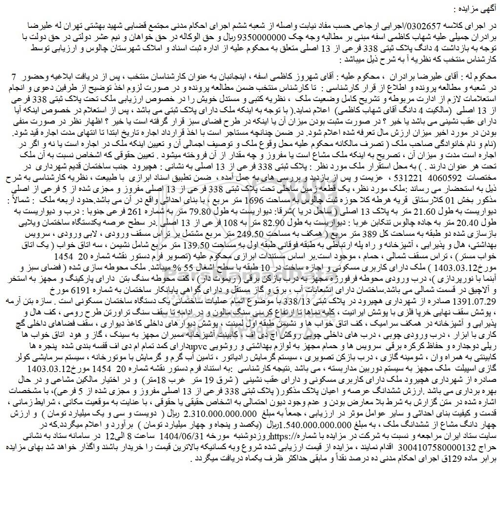 در اجرای کلاسه 0302657/اجرایی ارجاعی حسب مفاد نیابت واصله از شعبه ششم اجرای احکام مدنی مجتمع قضایی شهید بهشتی تهران له علیرضا برادران جمیلی علیه شهاب کاظمی اسفه مبنی بر مطالبه وجه چک 9350000000 ریال و حق الوکاله در حق خواهان و نیم عشر دولتی در حق دولت با توجه به بازداشت 4 دانگ پلاک ثبتی 338 فرعی از 13 اصلی متعلق به محکوم علیه از اداره ثبت اسناد و املاک شهرستان چالوس و ارزیابی توسط کارشناس منتخب که نظریه آ به شرح ذیل میباشد :
