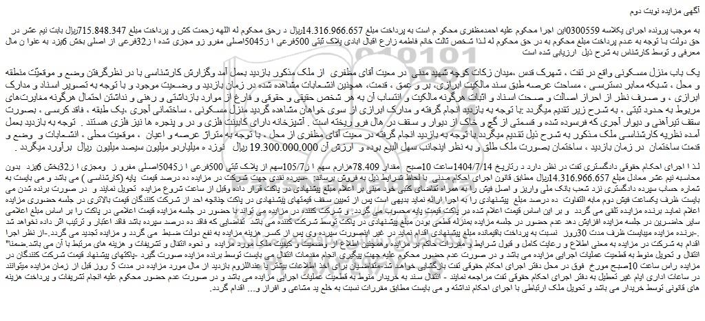 لذ ا اجرای احکام حقوقی دادگستری تفت در نظر دارد د رتاریخ 1404/7/14ساعت 10صبح مقدار 78.409هزارم سهم ا ز105/7سهم از پلاک ثبتی 500فرعی ا ز5045اصلی مفرو ز ومجزی ا ز32بخش 6یزد بدون محاسبه نیم عشر معادل مبلغ 14.316.966.657ریال مطابق قانون اجرای احکام مدنی با لحاظ شرایط ذیل به فروش برساند: -سپرده نقدی جهت شرکت در مزایده ده درصد قیمت پایه (کارشناسی ) می باشد و می بایست به شماره حساب سپرده دادگستری نزد شعب بانک ملی واریز و اصل فیش را به همراه تقاضای کتبی خود مبنی بر اعلام مبلغ پیشنهادی در پاکت قرار داده وقبل از ساعت شروع مزایده تحویل نمایند و در صورت برنده شدن می بایست ظرف یکساعت فیش دوم مابه التفاوت ده درصد مبلغ پیشنهادی را به اجرا ارائه نماید بدیهی است پس از تعیین سقف قیمتهای پیشنهادی در پاکت چنانچه احد از شرکت کنندگان قیمت بالاتری در جلسه حضوری مزایده اعلام نماید برنده مزایده تلقی می گردد و بر این اساس قیمت اعلام شده در پاکت قیمت پایه محسوب می گردد. و شرکت کننده در مزایده می تواند با حضور در جلسه مزایده قیمت اعلامی در پاکت را بر اساس مبلغ اعلامی سایر حاضرین در جلسه مزایده افزایش دهد عدم حضور در جلسه مزایده بمنزله قطعی بودن مبلغ پیشنهادی در پاکت توسط شرکت کننده می باشد تقاضایی که فاقد ده درصد سپرده باشد فاقد اعتبار و ترتیب اثر داده نخواهد شد .-برنده مزایده میبایست ظرف مدت 30روز نسبت به پرداخت باقیمانده مبلغ پیشنهادی اقدام نماید در غیر اینصورت سپرده وی پس از کسر هزینه مزایده به نفع دولت ضبط می گردد و مزایده تجدید می گردد.-از نظر اجرا اقدام به شرکت در مزایده به معنی اطلاع و رعایت کامل و قبول شرایط و مقررات حاکم بر مزایده وهمچنین اطلاع از وضعیت و کیفیت ملک مورد مزایده و نحوه انتقال و تشریفات و هزینه های مرتبط با آن می باشد.ضمنا" انتقال و تحویل منوط به قطعیت عملیات اجرایی مزایده می باشد و در صورت عدم حضور محکوم علیه جهت پیگیری انجام مقدمات انتقال می بایست توسط برنده مزایده صورت گیرد -پاکتهای پیشنهاد قیمت شرکت کنندگان در مزایده راس ساعت 10صبح مورخ فوق در محل دفتر اجرای احکام حقوقی تفت بازگشایی خواهد شد-متقاضیان برای اخذ اطلاعات بیشتر یا عنداللزوم بازدید از مال مورد مزایده در مدت 5 روز قبل از زمان مزایده میتوانند در ساعات اداری ایام غیر تعطیل به دفتر اجرای احکام حقوقی تفت مراجعه نمایند - انتقال سند به خریدار منوط به قطعیت عملیات اجرایی مزایده می باشد و در صورت عدم حضور محکوم علیه انجام تشریفات و پرداخت هزینه های قانونی توسط خریدار می باشد و تحویل ملک ارتباطی با اجرای احکام نداشته و می بایست مطابق مقررات نسبت به خلع ید مشاعی و افراز و... اقدام گردد.