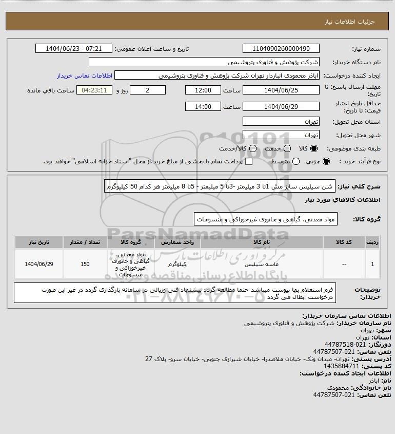 شرح کلی نیاز: شن سیلیس سایز مش 1تا 3 میلیمتر -3تا 5 میلیمتر - 5تا 8 میلیمتر هر کدام 50 کیلیوگرم