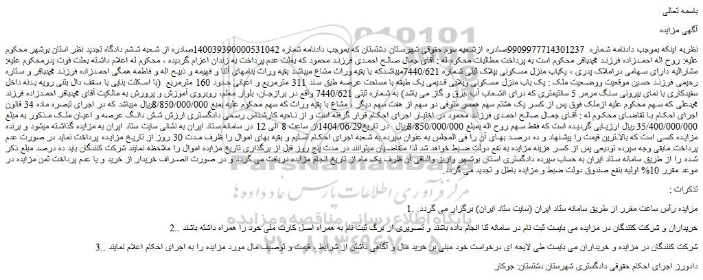 نظربه اینکه بموجب دادنامه شماره 9909977714301237صادره ازشعبه سوم حقوقی شهرستان دشتستان که بموجب دادنامه شماره 140039390000531042صادره از شعبه ششم دادگاه تجدید نظر استان بوشهر محکوم علیه: روح اله احمدزاده فرزند محمدباقر محکوم است به پرداخت مطالبات محکوم له : آقای جمال صالح احمدی فرزند محمود که بعلت عدم پرداخت به زندان اعزام گردیده ، محکوم له اعلام داشته بعلت فوت پدرمحکوم علیه: مشارالیه دارای سهامی دراملاک پدری ، یکباب منزل مسکونی بپلاک ثبتی شماره 7440/621میباشدکه با بقیه وراث مشاع میباشد بقیه وراث بنامهای آتنا و فهیمه و ذبیح اله و فاطمه همگی احمدزاده فرزند محمدباقر و ستاره رحیمی فرزند حسین موقعیت ووضعیت ملک : یک باب منزل مسکونی ویلایی قدیمی یک طبقه با مساحت عرصه طبق سند 311 مترمربع و اعیانی حدود 160 مترمربع (با اسکلت بنایی با سقف دال بتنی رویه بدنه داخل سفیدکاری با نمای بیرونی سنگ مرمر 5 سانتیمتری که درای انشعاب آب ،برق و گاز می باشد) به شماره ثبتی 7440/621 واقع در برازجان، بلوار معلم، روبروی آموزش و پرورش به مالکیت آقای محمدباقر احمدزاده فرزند محمدعلی که سهم محکوم علیه ازملک فوق پس از کسر یک هشتم سهم همسر متوفی دو سهم از هفت سهم دیگر ، مشاع با بقیه وراث که سهم محکوم علیه بمبغ 8/850/000/000ریال میباشد که در اجرای تبصره ماده 34 قانون اجرای احکام با تقاضای محکوم له : آقای جمال صالح احمدی فرزند محمود در اختیار اجرای احکام قرار گرفته است و از ناحیه کارشناس رسمی دادگستری ارزش شش دانگ عرصه و اعیان ملک مذکور به مبلغ 35/400/000/000 ریال ارزیابی گردیده است که فقط سهم روح اله بمبلغ 8/850/000/000ریال در تاریخ1404/06/29از ساعت 8 الی 12 در سامانه ستاد ایران به نشانی سایت ستاد ایران به مزایده گذاشته میشود و برنده مزایده کسی است که بالاترین قیمت را پیشنهاد و ده درصد بهای آن را فی المجلس به عنوان سپرده به شعبه اجرای احکام تسلیم و بقیه بهای اموال را ظرف مدت 30 روز از تاریخ مزایده پرداخت نماید در صورت عدم پرداخت مابقی وجه سپرده تودیعی پس از کسر هزینه مزایده به نفع دولت ضبط خواهد شد لذا متقاضیان میتوانند در مدت پنج روز قبل از برگذاری تاریخ مزایده اموال را ملاحظه نمایند شرکت کنندگان باید ده درصد مبلغ ذکر شده را از طریق سامانه ستاد ایران به حساب سپرده دادگستری استان بوشهر واریز والباقی آن ظرف یک ماه از تاریخ انجام مزایده دریافت می گردد و در صورت انصراف خریدار از خرید و یا عدم پرداخت ثمن مزایده در موعد مقرر 10% اولیه بنفع صندوق دولت ضبط و مزایده باطل و تجدید می گردد.