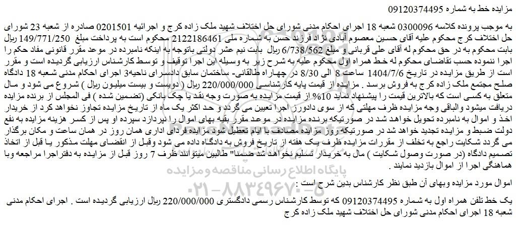 به موجب پرونده کلاسه 0300096 شعبه 18 اجرای احکام مدنی شورای حل اختلاف شهید ملک زاده کرج و اجرائیه 0201501 صادره از شعبه 23 شورای حل اختلاف کرج محکوم علیه آقای حسین معصوم آبادی نژاد فرزند حسن به شماره ملی 2122186461 محکوم است به پرداخت مبلغ 149/771/250 ریال بابت محکوم به در حق محکوم له آقای علی قربانی و مبلغ 6/738/562 ریال بابت نیم عشر دولتی باتوجه به اینکه نامبرده در موعد مقرر قانونی مفاد حکم را اجرا ننموده حسب تقاضای محکوم له خط همراه اول محکوم علیه به شرح زیر به وسیله این اجرا توقیف و توسط کارشناس ارزیابی گردیده است و مقرر است از طریق مزایده در تاریخ 1404/7/6 ساعت 8 الی 8/30 در چهاراه طالقانی- ساختمان سابق دادسرای ناحیه3 اجرای احکام مدنی شعبه 18 دادگاه صلح مجتمع ملک زاده کرج به فروش برسد . مزایده از قیمت پایه کارشناسی 220/000/000 ریال ( دویست و بیست میلیون ریال ) شروع می شود و مال متعلق به کسی است که بالاترین قیمت را پیشنهاد نماید 10% از قیمت مزایده به صورت وجه نقد یا چک بانکی (تضمین شده ) فی المجلس از برنده مزایده دریافت میشود والباقی وجه مزایده ظرف مهلتی که از سوی دادورز اجرا تعیین می گردد و حد اکثر یک ماه از تاریخ مزایده تجاوز نخواهد کرد از خریدار اخذ و اموال به نامبرده تحویل خواهد شد در صورتیکه برنده مزایده در موعد مقرر بقیه بهای اموال را نپردازد سپرده او پس از کسر هزینه مزایده به نفع دولت ضبط و مزایده تجدید خواهد شد در صورتیکه روز مزایده مصادف با ایام تعطیل شود مزایده فردای اداری همان روز در همان ساعت و مکان برگذار می گردد شکایت راجع به تخلف از مقررات مزایده ظرف یک هفته از تاریخ فروش به دادگاه داده می شود وقبل از انقضای مهلت مذکور یا قبل از اتخاذ تصمیم دادگاه (در صورت وصول شکایت ) مال به خریدار تسلیم نخواهد شد ضمنا" طالبین میتوانند ظرف 7 روز قبل از مزایده به دفتراجرا مراجعه وبا هماهنگی اجرا از اموال بازدید نمایند .