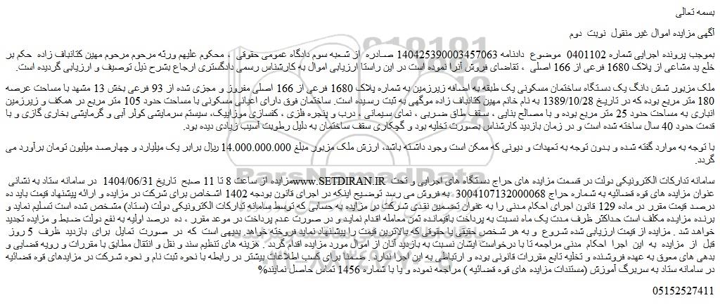 مزایده از ساعت 8 تا 11 صبح تاریخ 1404/06/31 در سامانه ستاد به نشانی سایت ستاد ایران سامانه تدارکات الکترونیکی دولت در قسمت مزایده های حراج دستگاه های اجرایی و تحت عنوان مزایده های قوه قضائیه به شماره حراج 3004107132000068 به فروش می رسد توضیح اینکه در اجرای قانون بودجه 1402 اشخاص برای شرکت در مزایده و ارائه پیشنهاد قیمت باید ده درصد قیمت مقرر در ماده 129 قانون اجرای احکام مدنی را به عنوان تضمین نقدی شرکت در مزایده به حسابی که توسط سامانه تدارکات الکترونیکی دولت (ستاد) مشخص شده است تسلیم نماید و برنده مزایده مکلف است حداکثر ظرف مدت یک ماه نسبت به پرداخت باقیمانده ثمن معامله اقدام نماید و در صورت عدم پرداخت در موعد مقرر ، ده درصد اولیه به نفع دولت ضبط و مزایده تجدید خواهد شد . مزایده از قیمت ارزیابی شده شروع و به هر شخص حقیقی یا حقوقی که بالاترین قیمت را پیشنهاد نماید فروخته خواهد. بدیهی است که در صورت تمایل برای بازدید ظرف 5 روز قبل از مزایده به این اجرا احکام مدنی مراجعه تا با درخواست ایشان نسبت به بازدید آنان از اموال مورد مزایده اقدام گردد . هزینه های تنظیم سند و نقل و انتقال مطابق با مقررات و رویه قضایی و بدهی های معوق به عهده فروشنده و تخلیه تابع مقررات قانونی بوده و ارتباطی به این اجرا ندارد . ضمنا برای کسب اطلاعات بیشتر در رابطه با نحوه ثبت نام و نحوه شرکت در مزایدهای قوه قضائیه در سامانه ستاد به سربرگ آموزش (مستندات مزایده های قوه قضائیه ) مراجعه نموده و یا با شماره 1456 تماس حاصل نمایند%