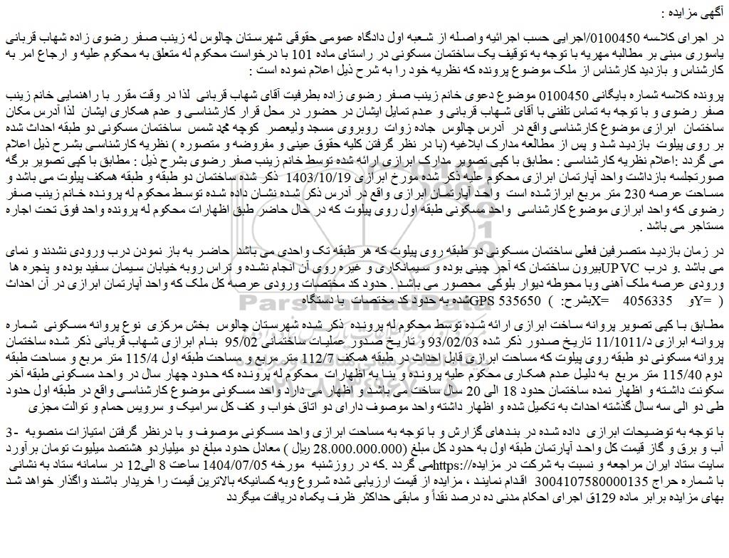 پرونده کلاسه شماره بایگانی 0100450 موضوع دعوی خانم زینب صفر رضوی زاده بطرفیت آقای شهاب قربانی لذا در وقت مقرر با راهنمایی خانم زینب صفر رضوی و با توجه به تماس تلفنی با آقای شهاب قربانی و عدم تمایل ایشان در حضور در محل قرار کارشناسی و عدم همکاری ایشان لذا آدرس مکان ساختمان ابرازی موضوع کارشناسی واقع در آدرس چالوس جاده زوات روبروی مسجد ولیعصر کوچه محمد شمس ساختمان مسکونی دو طبقه احداث شده بر روی پیلوت بازدید شد و پس از مطالعه مدارک ابلاغیه (با در نظر گرفتن کلیه حقوق عینی و مفروضه و متصوره ) نظریه کارشناسی بشرح ذیل اعلام می گردد :اعلام نظریه کارشناسی : مطابق با کپی تصویر مدارک ابرازی ارائه شده توسط خانم زینب صفر رضوی بشرح ذیل : مطابق با کپی تصویر برگه صورتجلسه بازداشت واحد آپارتمان ابرازی محکوم علیه ذکر شده مورخ ابرازی 1403/10/19 ذکر شده ساختمان دو طبقه و طبقه همکف پیلوت می باشد و مساحت عرصه 230 متر مربع ابرازشده است واحد آپارتمان ابرازی واقع در آدرس ذکر شده نشان داده شده توسط محکوم له پرونده خانم زینب صفر رضوی که واحد ابرازی موضوع کارشناسی واحد مسکونی طبقه اول روی پیلوت که در حال حاضر طبق اظهارات محکوم له پرونده واحد فوق تحت اجاره مستاجر می باشد .