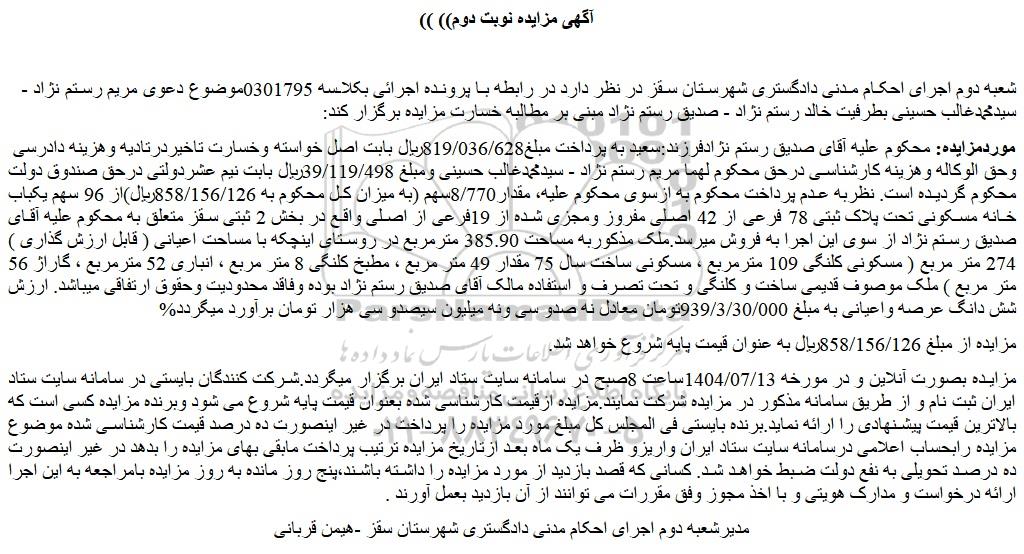 شعبه دوم اجرای احکام مدنی دادگستری شهرستان سقز در نظر دارد در رابطه با پرونده اجرائی بکلاسه 0301795موضوع دعوی مریم رستم نژاد - سیدمحمدغالب حسینی بطرفیت خالد رستم نژاد - صدیق رستم نژاد مبنی بر مطالبه خسارت مزایده برگزار کند: