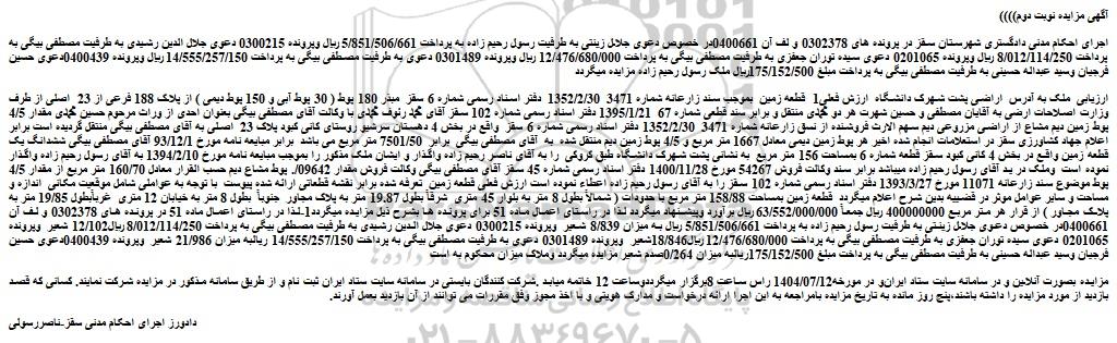 اجرای احکام مدنی دادگستری شهرستان سقز در پرونده های 0302378 و لف آن 0400661در خصوص دعوی جلال زینتی به طرفیت رسول رحیم زاده به پرداخت 5/851/506/661 ریال وپرونده 0300215 دعوی جلال الدین رشیدی به طرفیت مصطفی بیگی به پرداخت 8/012/114/250 ریال وپرونده 0201065 دعوی سیده توران جعفزی به طرفیت مصطفی بیگی به پرداخت 12/476/680/000 ریال وپرونده 0301489 دعوی به طرفیت مصطفی بیگی به پرداخت 14/555/257/150 ریال وپرونده 0400439دعوی حسین فرجیان وسید عبداله حسینی به طرفیت مصطفی بیگی به پرداخت مبلغ 175/152/500ریال ملک رسول رحیم زاده مزایده میگردد