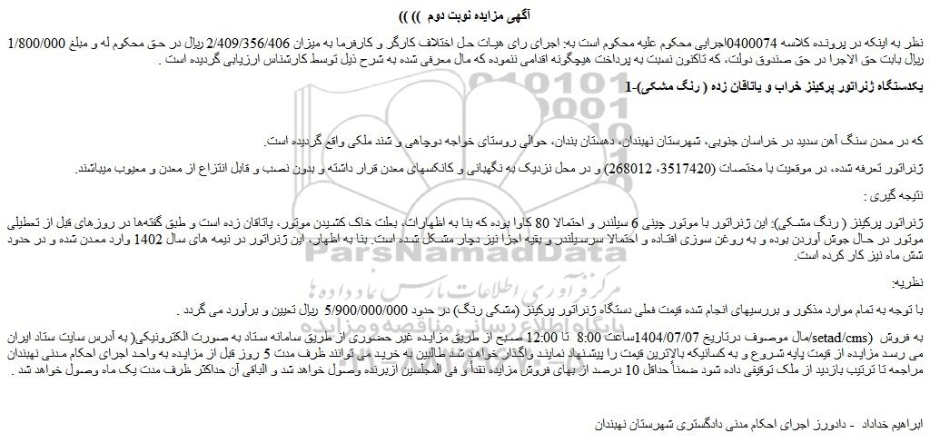 نظر به اینکه در پرونده کلاسه 0400074اجرایی محکوم علیه محکوم است به: اجرای رای هیات حل اختلاف کارگر و کارفرما به میزان 2/409/356/406 ریال در حق محکوم له و مبلغ 1/800/000 ریال بابت حق الاجرا در حق صندوق دولت، که تاکنون نسبت به پرداخت هیچگونه اقدامی ننموده که مال معرفی شده به شرح ذیل توسط کارشناس ارزیابی گردیده است .