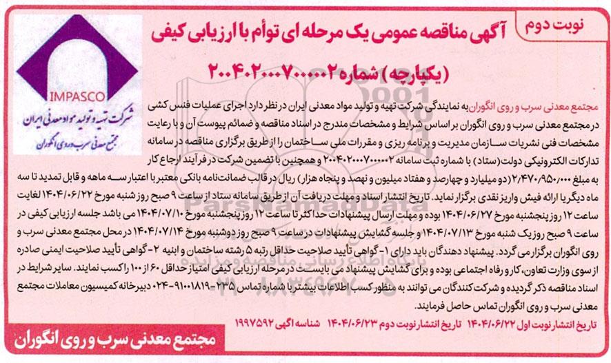 مجتمع معدنی سرب و روی انگوران به نمایندگی شرکت تهیه و تولید مواد معدنی ایران در نظر دارد اجرای عملیات فنس کشی در مجتمع معدنی سرب و روی انگوران بر اساس شرایط و مشخصات مندرج در اسناد مناقصه و ضمائم پیوست آن و با رعایت مشخصات فنی نشریات سازمان مدیریت و برنامه ریزی و مقررات ملی ساختمان را از طریق برگزاری مناقصه در سامانه تدارکات الکترونیکی دولت (ستاد) با شماره ثبت سامانه 2004020007000002 و همچنین با تضمین شرکت در فرآیند ارجاع کار به مبلغ 2.470.950.000 دو میلیارد و چهارصد و هفتاد میلیون و نهصد و پنجاه هزار ریال در قالب ضمانت نامه بانکی معتبر با اعتبار سه ماهه و قابل تمدید تا سه ماه دیگر یا ارائه فیش واریز نقدی برگزار نماید .