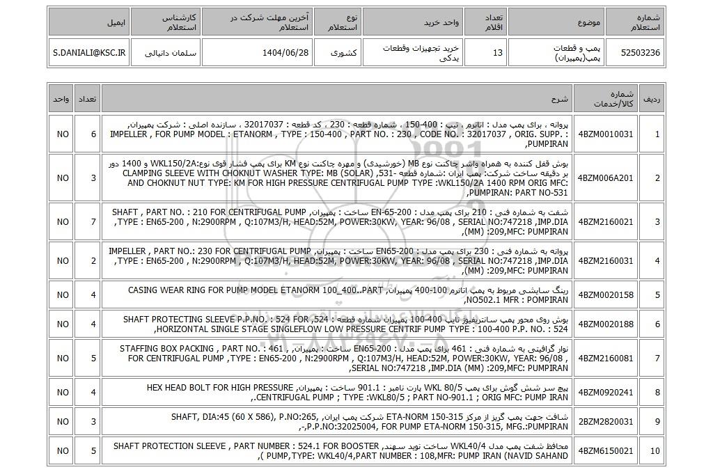 | 52503236 | پمپ و قطعات پمپ(پمپیران) | 13 | خرید تجهیزات وقطعات یدکی | کشوری | 1404/06/28 | سلمان دانیالی | S.DANIALI@KSC.IR |