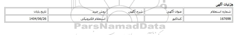| 167698 | کنتاکتور | استعلام الکترونیکی | 1404/06/26 |