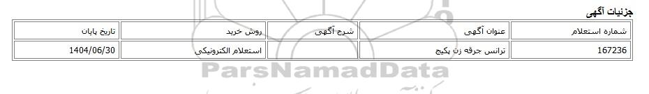 | 167236 | ترانس جرقه زن پکیج | استعلام الکترونیکی | 1404/06/30 |