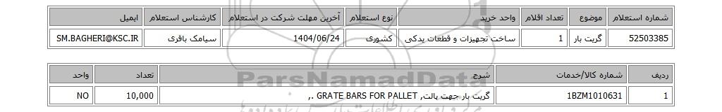 | 52503385 | گریت بار | 1 | ساخت تجهیزات و قطعات یدکی | کشوری | 1404/06/24 | سیامک باقری | SM.BAGHERI@KSC.IR |