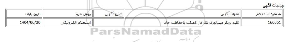 | 166051 | کلید بریکر مینیاتوری تک فاز کمپکت باحفاظت جان | استعلام الکترونیکی | 1404/06/30 |