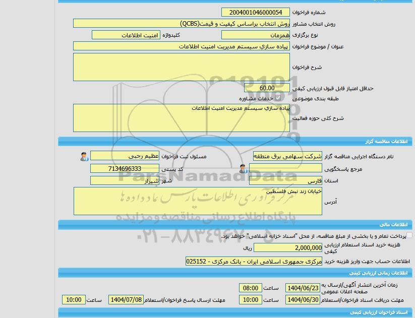 نام دستگاه اجرایی مناقصه گزار شرکت سهامی برق منطقه ای فارس مسئول ثبت مناقصه