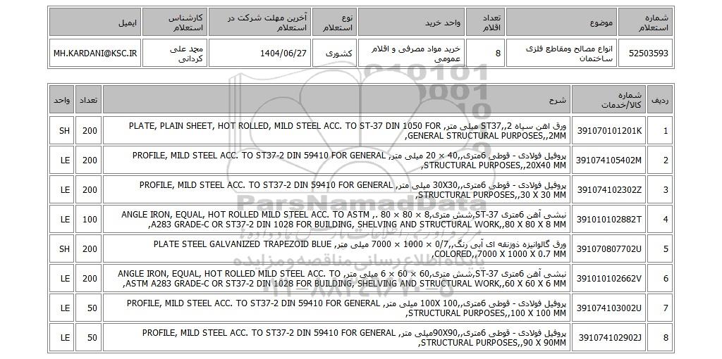 | 52503593 | انواع مصالح ومقاطع فلزی ساختمان | 8 | خرید مواد مصرفی و اقلام عمومی | کشوری | 1404/06/27 | محمد علی کردانی | MH.KARDANI@KSC.IR |
