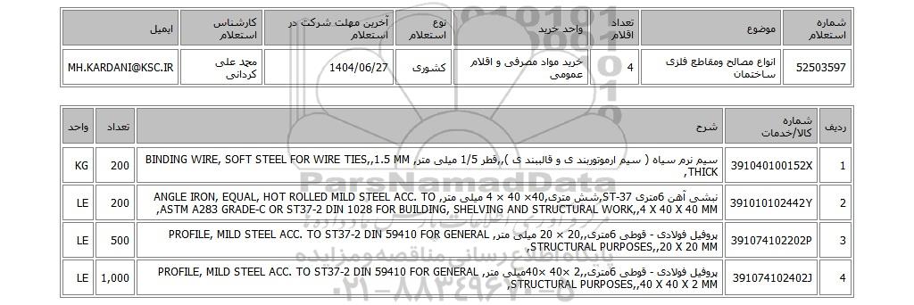 | 52503597 | انواع مصالح ومقاطع فلزی ساختمان | 4 | خرید مواد مصرفی و اقلام عمومی | کشوری | 1404/06/27 | محمد علی کردانی | MH.KARDANI@KSC.IR |