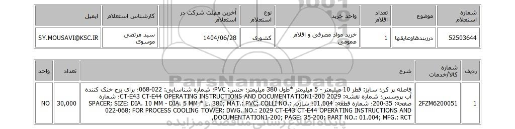 | 52503644 | درزبندهاوعایقها | 1 | خرید مواد مصرفی و اقلام عمومی | کشوری | 1404/06/28 | سید مرتضی موسوی | SY.MOUSAVI@KSC.IR |